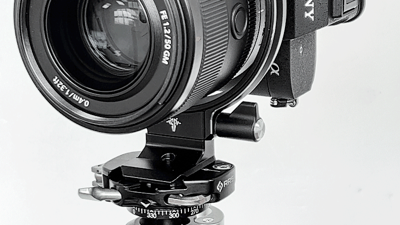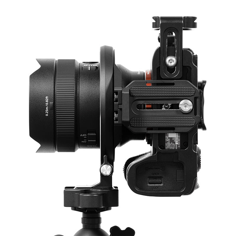 While keeping the camera fixed on a tripod, this revolutionary item allows for an instant switch from horizontal to vertical shooting. It enables free adjustment of the camera by 180 degrees without shifting the optical axis. Available in a variety of sizes to suit different camera dimensions.